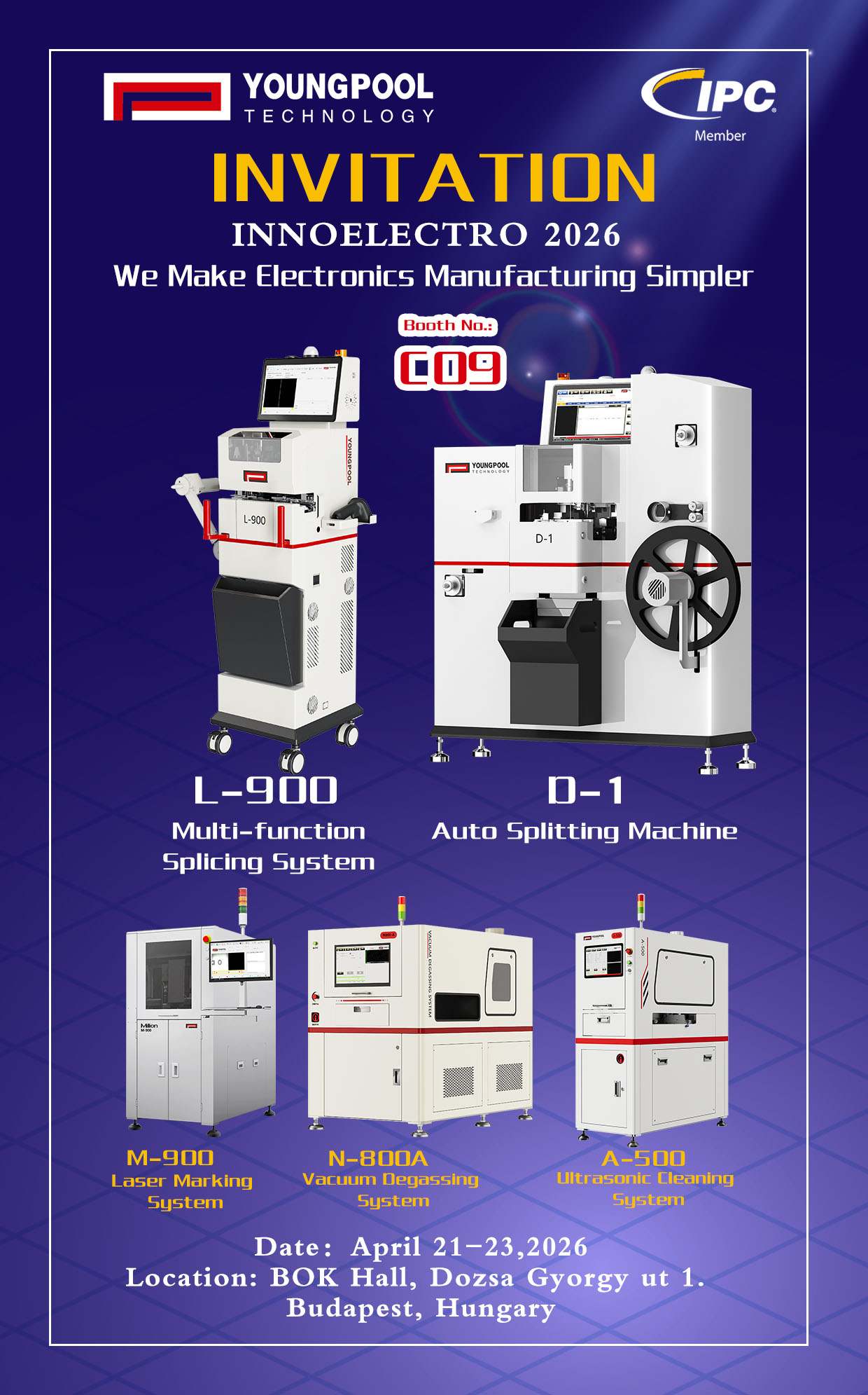 Youngpool Technology sincerely invites you to visit Booth C09 for face-to-face discussions and explore the future direction of intelligent SMT manufacturing together. We look forward to meeting you in Budapest, Hungary, and embarking on a new chapter of efficient, intelligent, and reliable electronics manufacturing.
